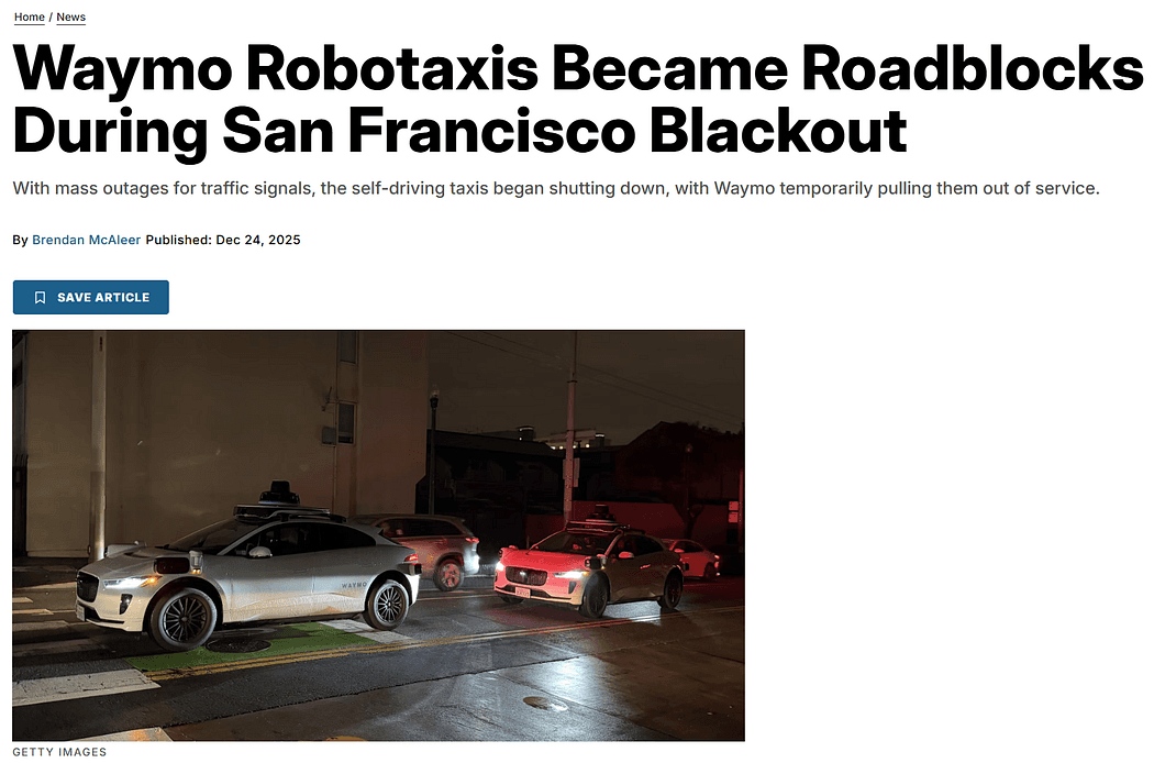 Recently, there was a major controversy after a large-scale power outage in San Francisco caused a robotaxi service to be temporarily suspended, with some vehicles reportedly stopping in intersections or blocking roads and creating congestion.